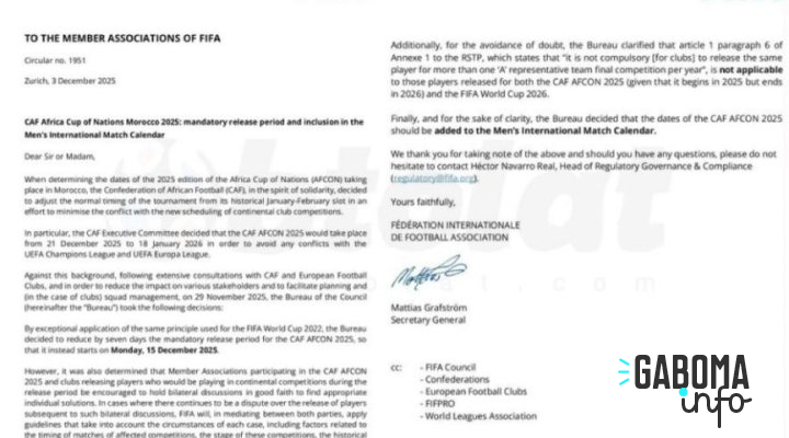CAN 2025 : La FIFA fixe au 15 décembre, la date libération des joueurs à 6 jours de la compétition Photo : Droits réservés/GabomaInfo